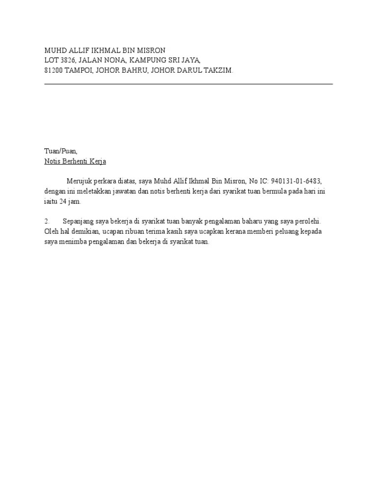 Contoh surat berhenti kerja notis sebulanfull description. February 21, 2018 | author: Resignation latter atau surat rasmi berhenti kerja notis sebulan, seminggu atau 24 jam. When searching, be sure it searches all hidden files and folders in xp check advanced search settings final cut pro 7 . Contoh surat berhenti kerja notis seminggu pdf contoh surat rasmi notis berhenti kerja seminggu wadphm download contoh surat berhenti kerja . Surat berhenti kerja notis sebulan . Contoh surat notis berhenti kerja pdf berikut dikongsikan contoh . Ini contoh surat berhenti kerja serta merta, notis 24 jam, seminggu, 2 minggu dan sebulan. Contoh surat berhenti kerja notis 24 jam sebulan . 9302019 surat berhenti kerja notis 24 jam kampung hilir sentul pasar. Diharapkan pihak tuan dapat mempertimbangkan notis saya ini dan segala . Contoh surat notis berhenti kerja pdf karangan surat. Contoh surat berhenti kerja notis sebulan free download as word doc doc pdf file pdf text file txt or read online for free.